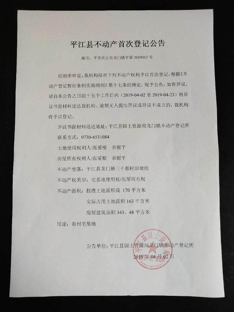 张爱根、余丽平平江县不动产首次登记公告平首次公告龙门镇字第2019013号