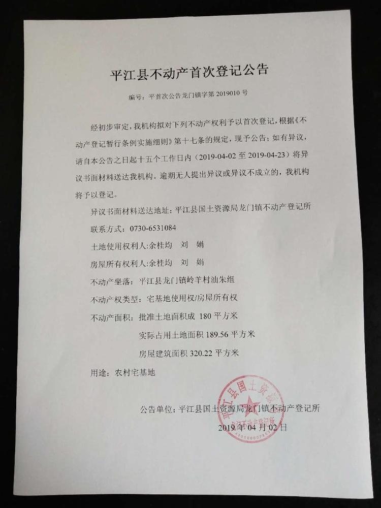 余桂均、刘娟平江县不动产首次登记公告平首次公告龙门镇字第2019010号
