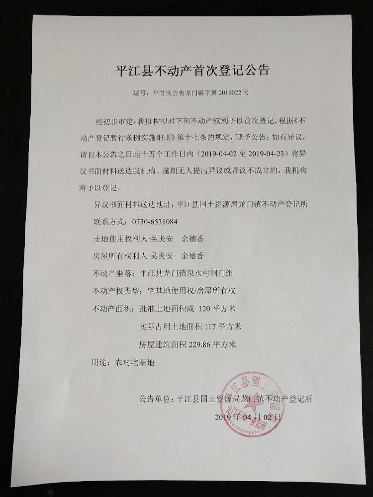 吴炎安、余德香平江县不动产首次登记公告平首次公告龙门镇字第2019022号