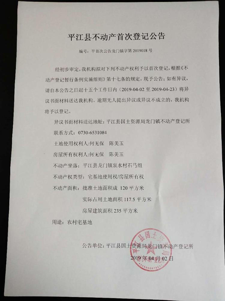 何无保、陈美玉平江县不动产首次登记公告平首次公告龙门镇字第2019018号