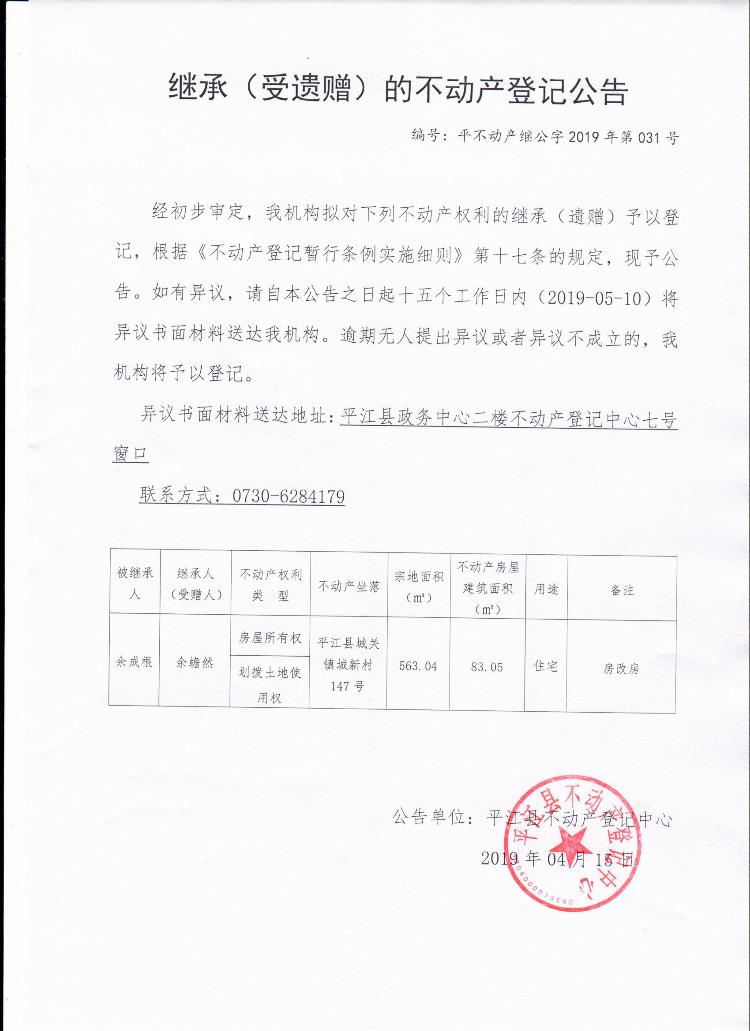 余蟾然继承(受遗赠)的不动产登记公告平不动产继公字2019年第031号