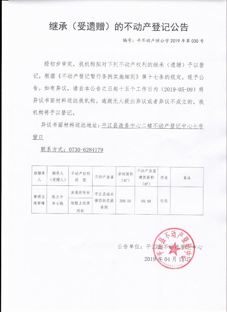陈立平、李七娥继承(受遗赠)的不动产登记公告平不动产继公字2019年第030号