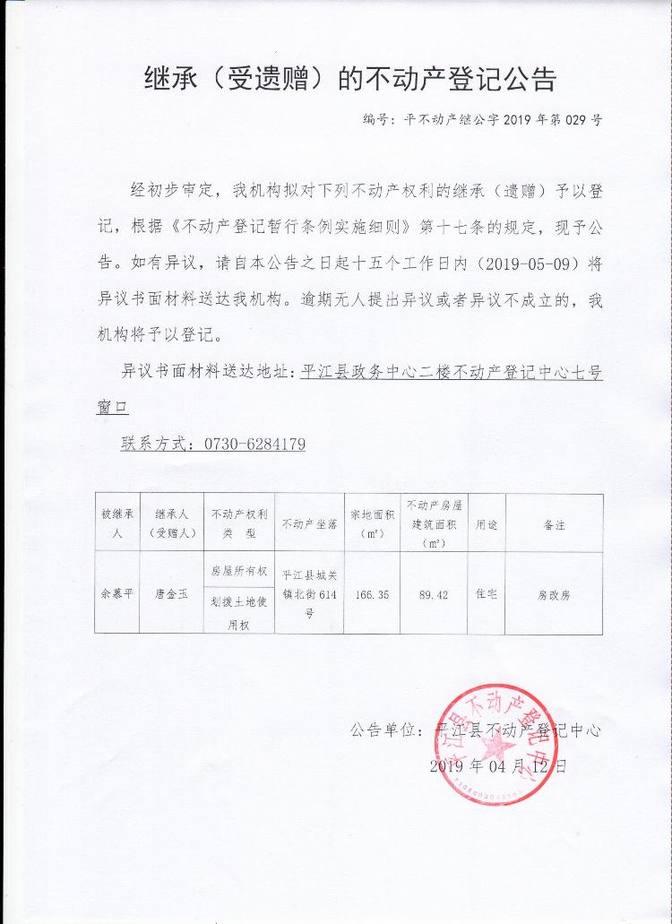 唐金玉继承(受遗赠)的不动产登记公告平不动产继公字2019年第029号