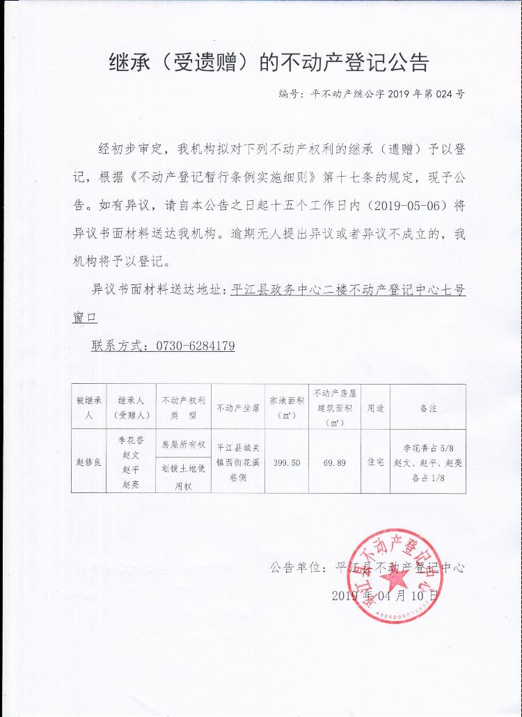 李花香、赵文、赵平、赵亮继承(受遗赠)的不动产登记公告平不动产继公字2019年第024号