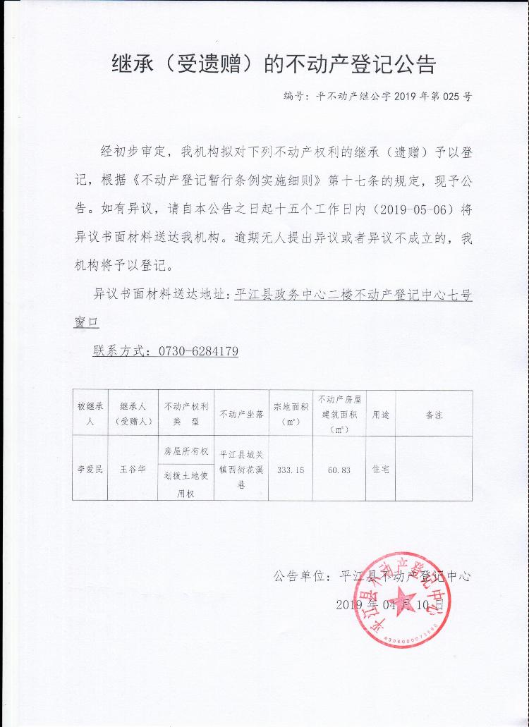 王谷华继承(受遗赠)的不动产登记公告平不动产继公字2019年第025号