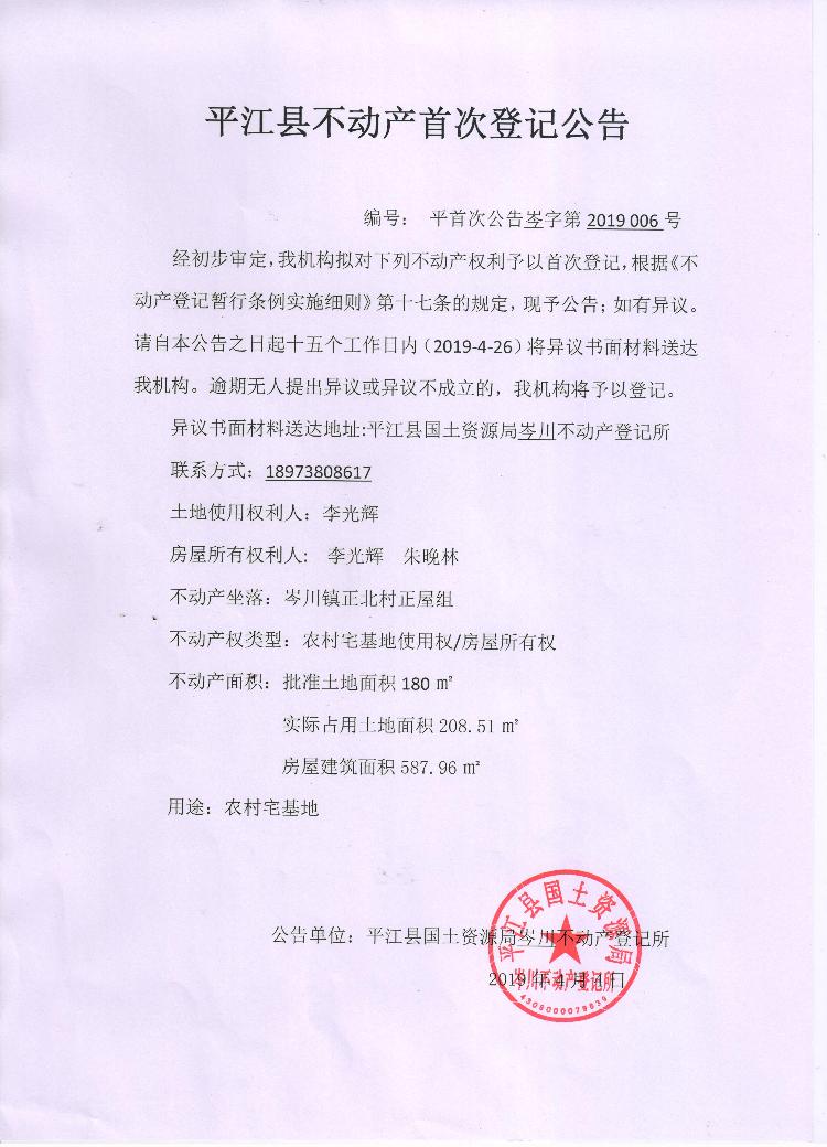 李光辉 朱晚林平江县不动产首次登记公告 岑字第2019006号