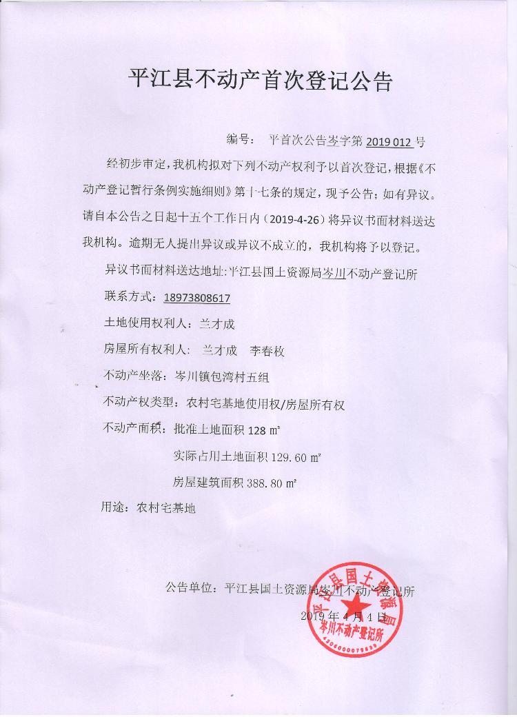兰才成 李春枚平江县不动产首次登记公告 岑字第2019012号