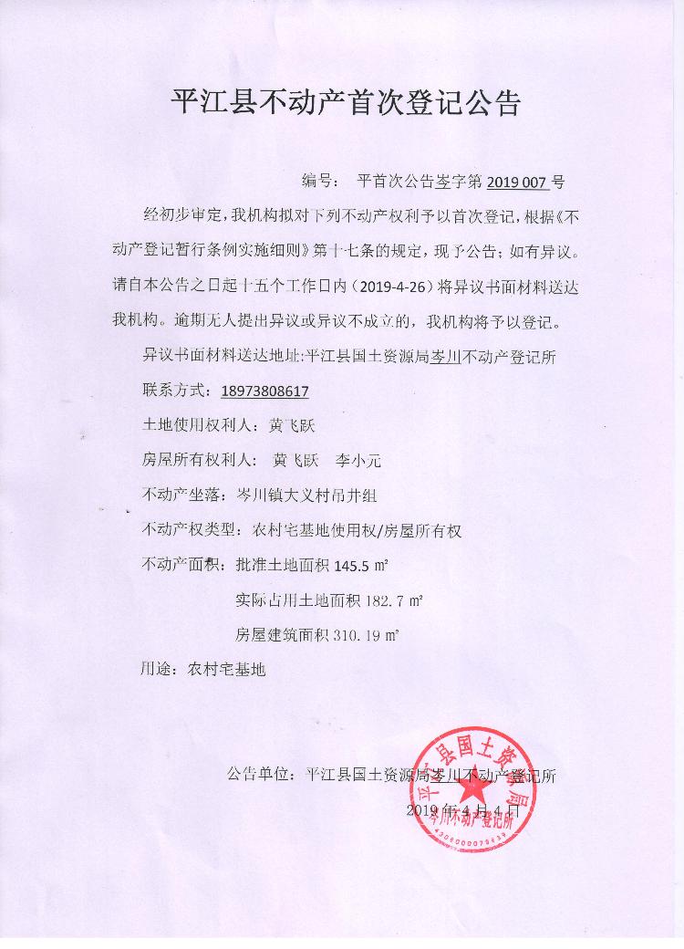 黄飞跃 李小元平江县不动产首次登记公告 岑字第2019007号