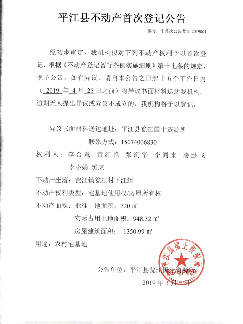 李合意 黄红艳 张涧华 李同来 凌卧飞 李小娟 樊虎不动产首次登记公告 瓮江2019001
