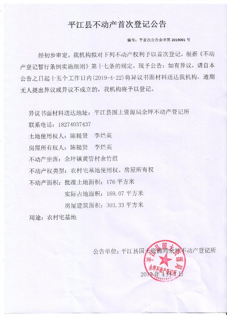 陈糙贤 李烂英平江县不动产首次登记公告 余字第2019001号