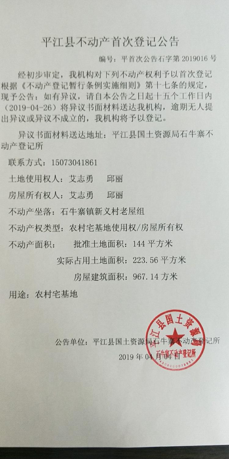 艾志勇 邱丽平江县不动产首次登记公告 石字第2018016号