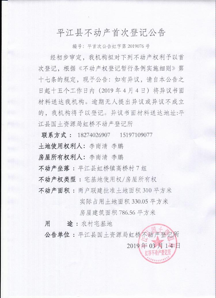 李南清 李鹏不动产首次登记公告平首次登记公告虹字第2019076号