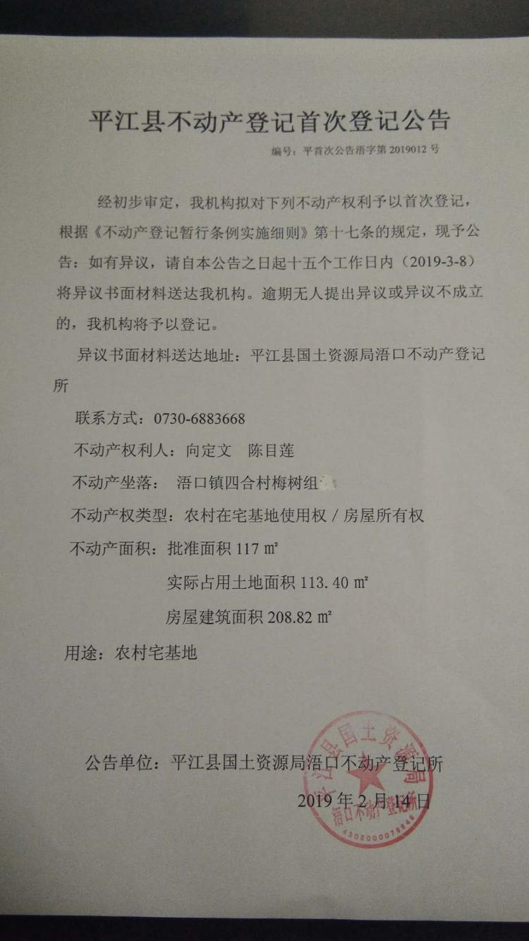 向定文 陈目莲 不动产首次登记公告 浯字第2019012号