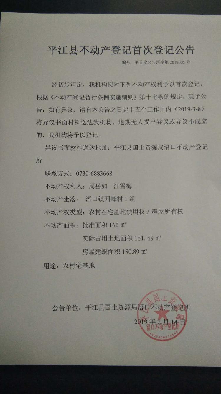 周岳如 江雪梅 不动产首次登记公告 浯字第2019005号