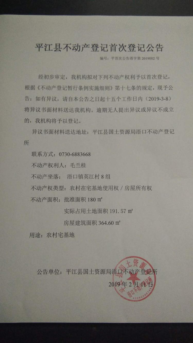 毛兰桂 不动产首次登记公告 浯字第2019002号