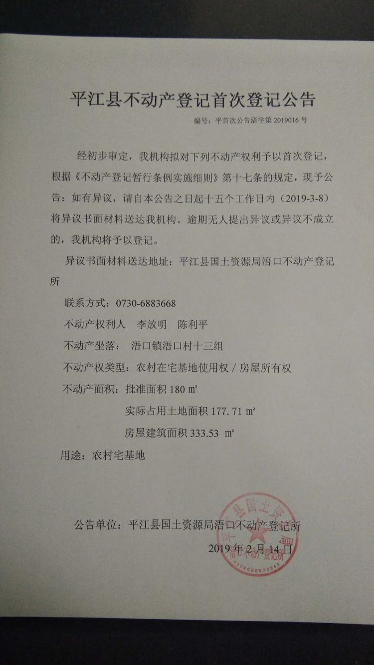 李放明 陈利平 不动产首次登记公告 浯字第2019016号