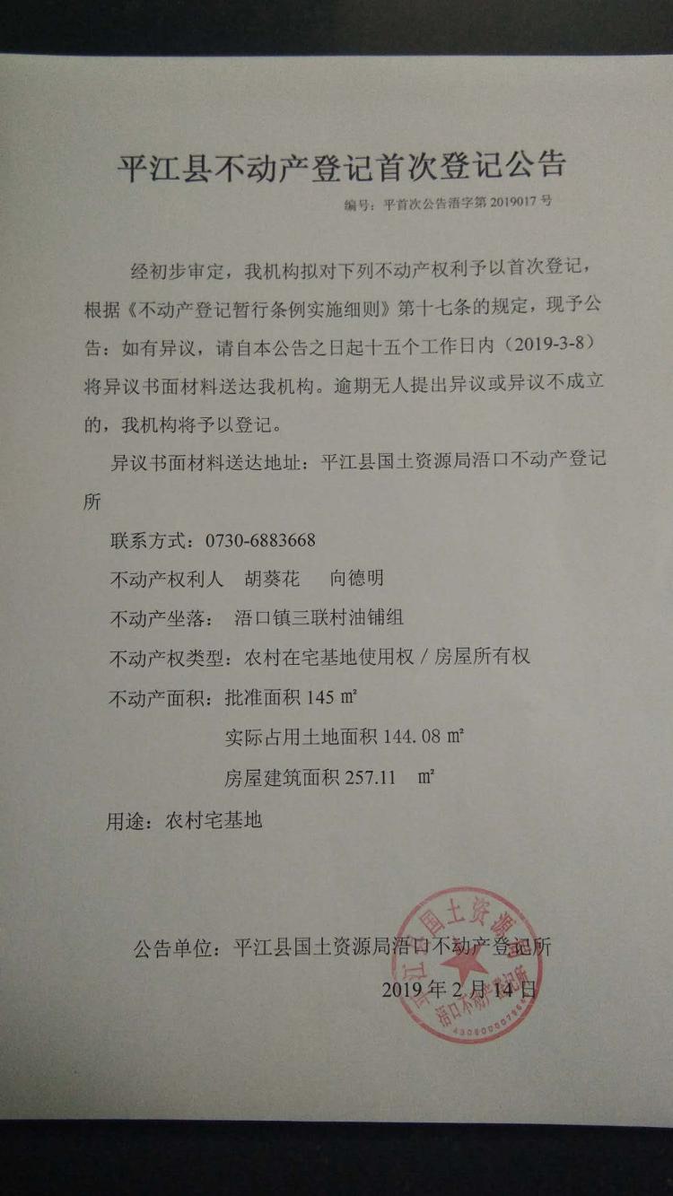 胡葵花 向德明 不动产首次登记公告 浯字第2019017号