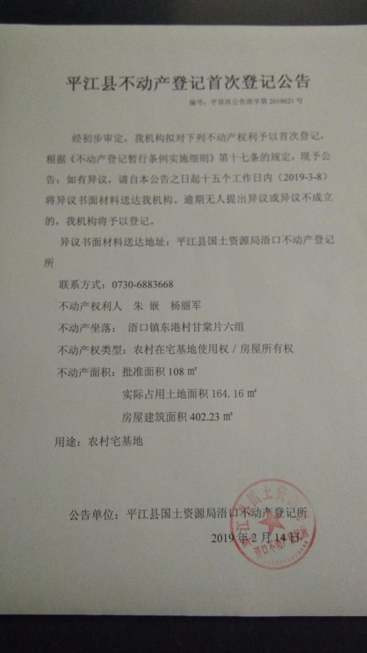 朱嵌 杨丽军 不动产首次登记公告 浯字第2019021号