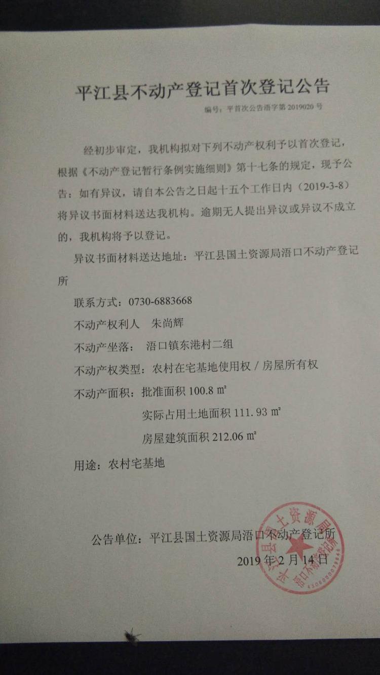 朱尚辉 不动产首次登记公告 浯字第2019020号