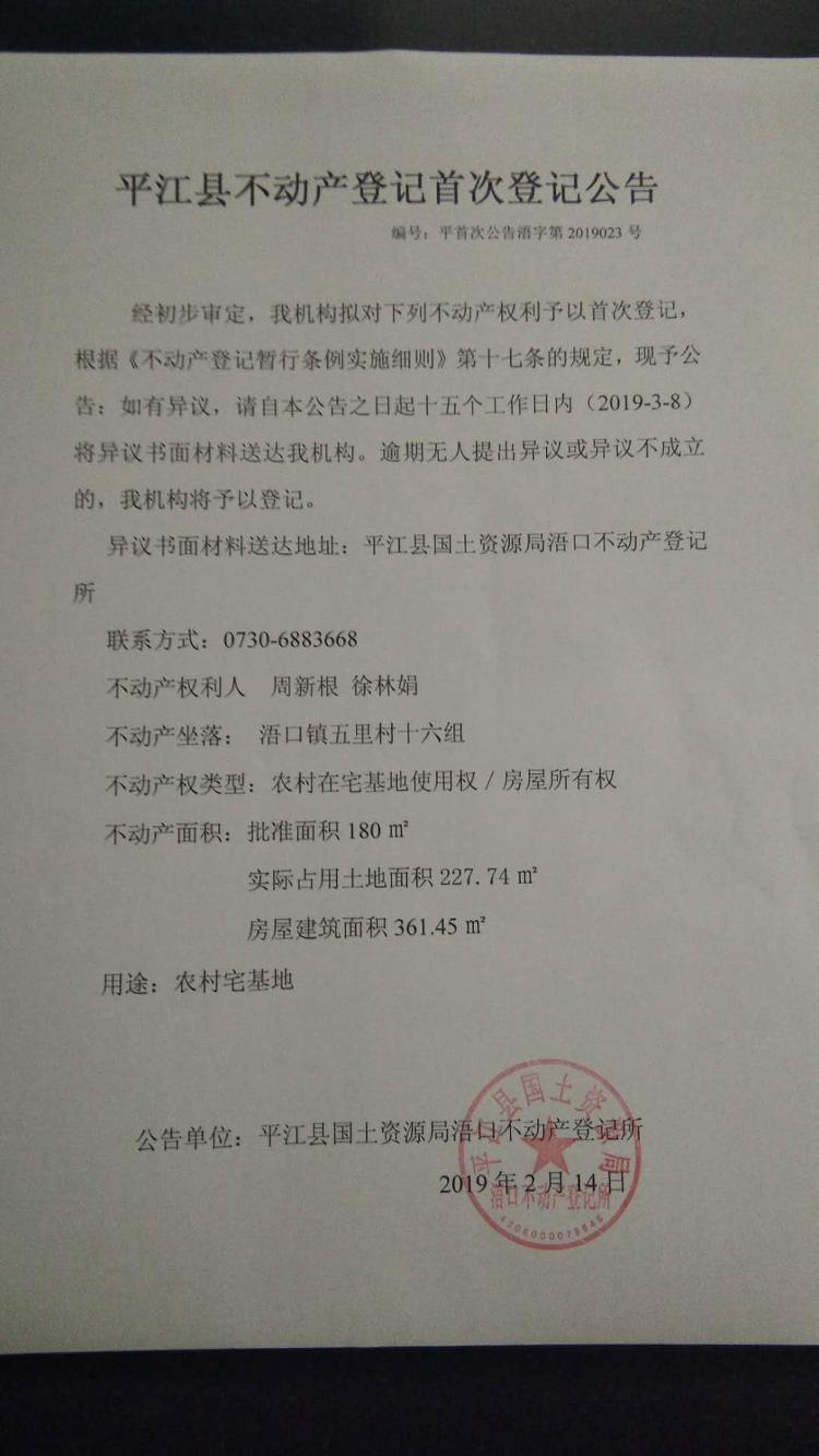 周新根 徐林娟 不动产首次登记浯字第2019023号