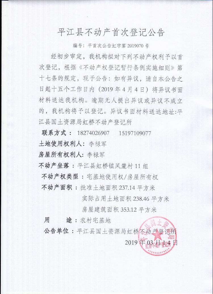 李禄军不动产首次登记公告平首次登记公告虹字第2019070号