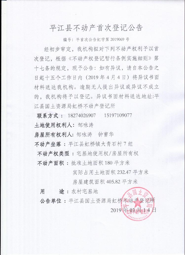 邹咏涛 钟曹华不动产首次登记公告平首次登记公告虹字第2019069号