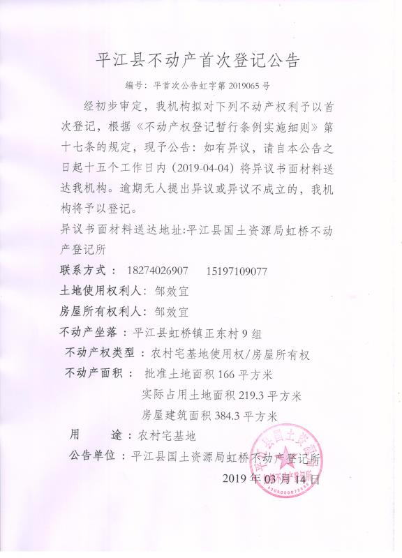 邹郊宜不动产首次登记公告平首次登记虹字第2019065号