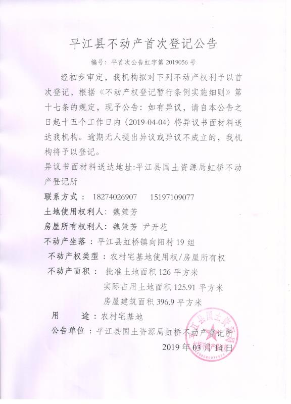 魏策芳 尹开花不动产首次登记公告平首次登记虹字第2019056号