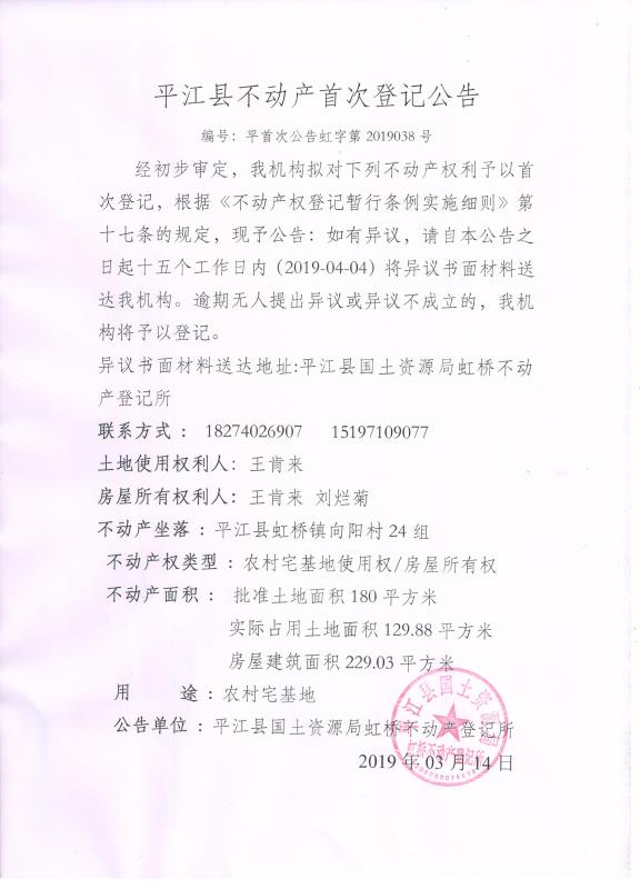 王肯来 刘烂菊不动产首次登记公告平首次登记虹字第2019038号