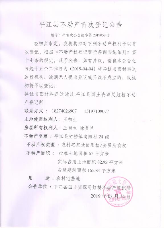 王初生 徐美兰不动产首次登记公告平首次登记虹字第2019058号