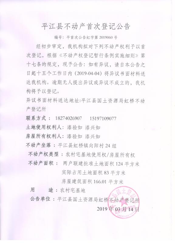 漆验如 漆兴如不动产首次登记公告平首次登记虹字第2019060号
