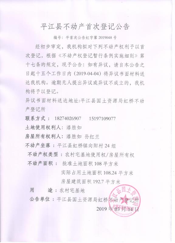 漆胜如 孙红兰不动产首次登记公告平首次登记虹字第2019048号