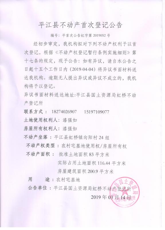 漆强如不动产首次登记公告平首次登记虹字第2019052号