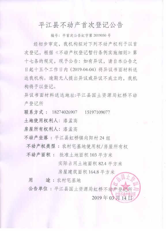 漆孟高不动产首次登记公告平首次登记虹字第2019050号