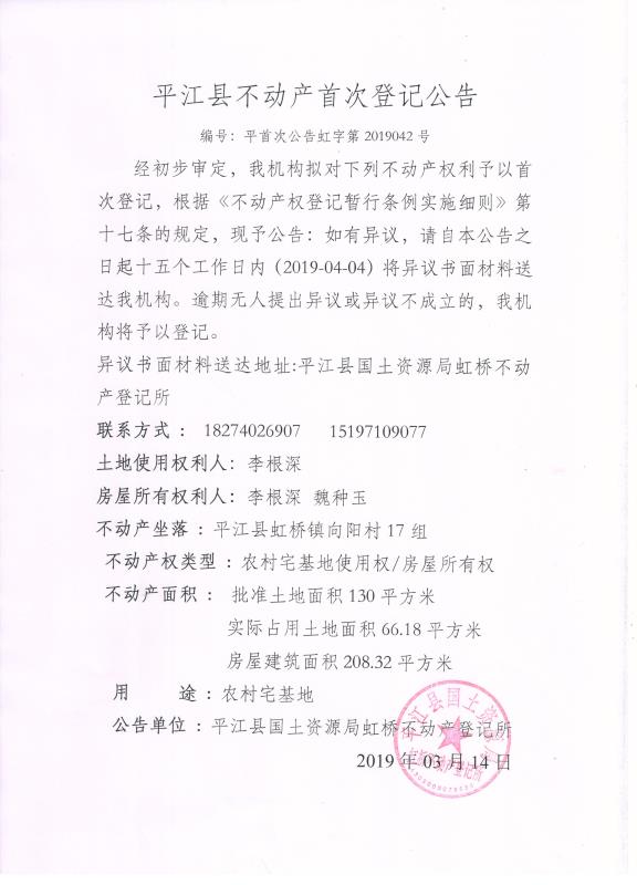 李根深 魏种玉不动产首次登记公告平首次登记虹字第2019042号