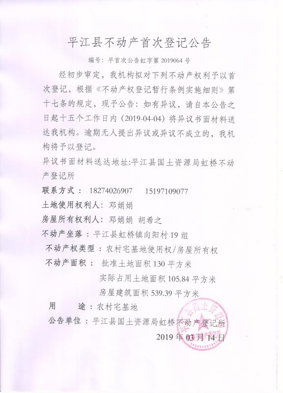 邓娟娟 胡希之不动产首次登记公告平首次登记虹字第2019064号