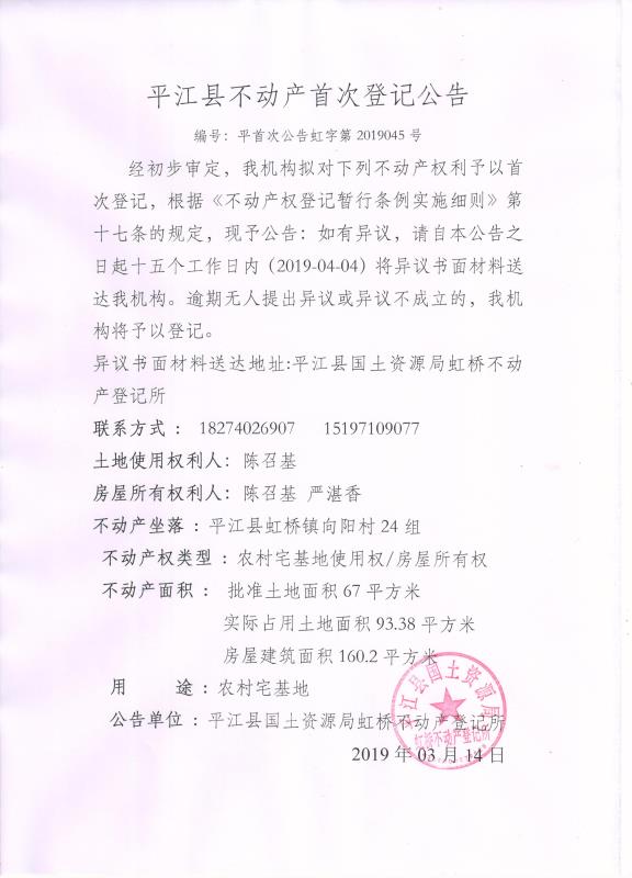 陈召基 严湛香不动产首次登记公告平首次登记虹字第2019045号