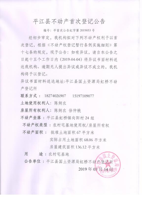 陈炯农 徐仲桃不动产首次登记公告平首次登记虹字第2019053号
