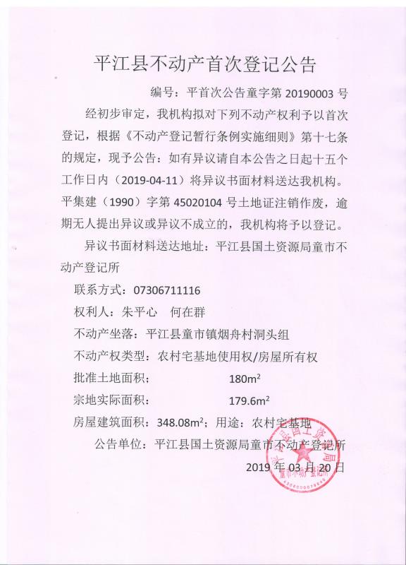 朱平心 何在群平江县不动产首次登记公告 童字第20190003号