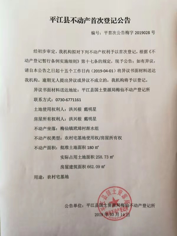 洪兴根 戴明星不动产首次登记 梅字2019028号