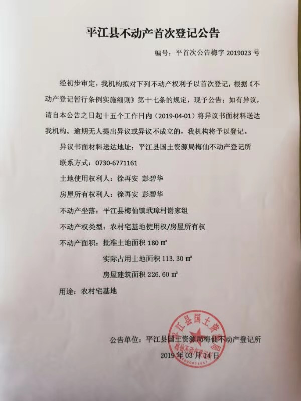 徐再安 彭碧华不动产首次登记 梅字2019023号
