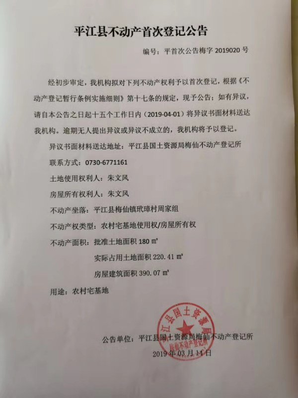 朱文风不动产首次登记 梅字2019020号