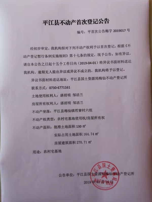 湛招明 邹活兰不动产首次登记 梅字2019017号