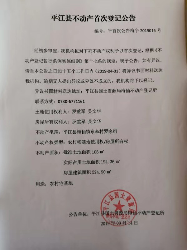 罗重军 吴文华不动产首次登记 梅字2019015号
