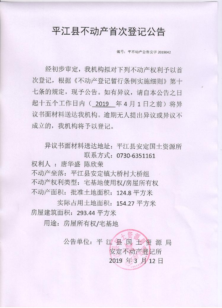 唐华盛 陈欣荣不动产首次登记 安字2019042