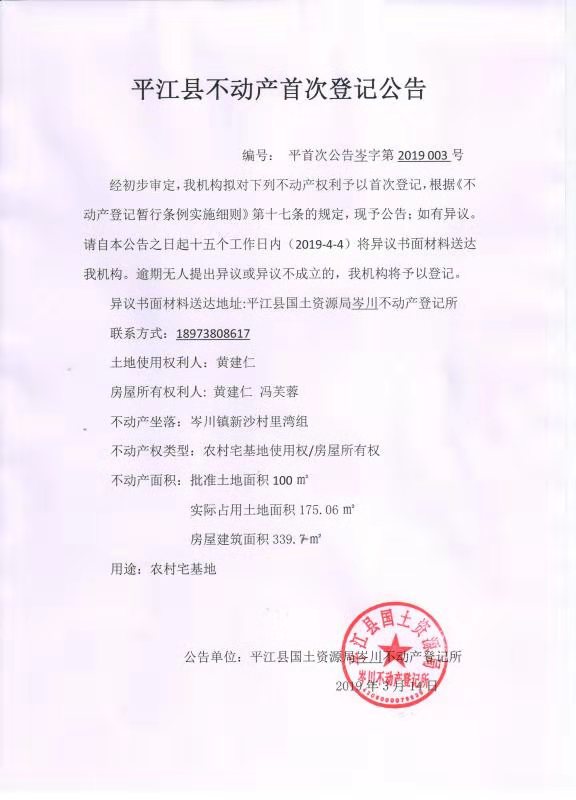 黄建仁 冯芙蓉不动产首次登记公告 岑字第2019003号