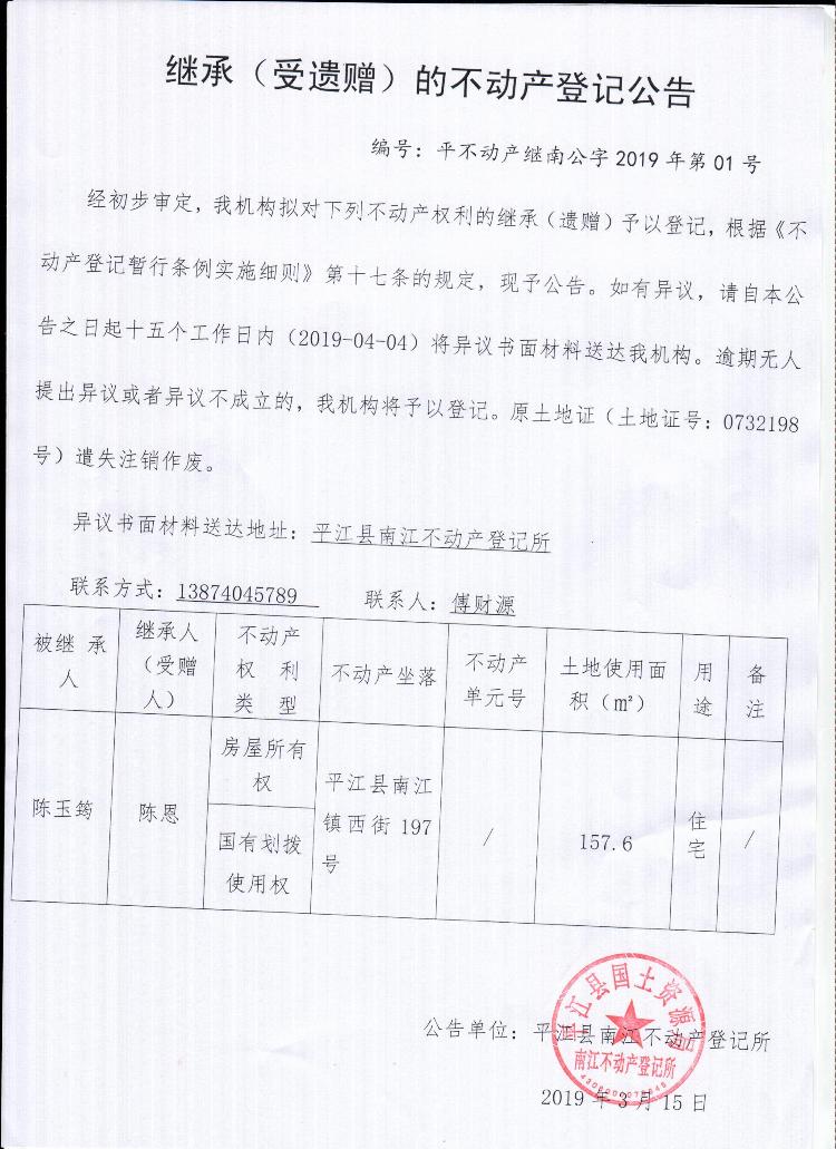 陈恩继承(受遗赠)的不动产登记公告 平不动产继南公字2019年第01号