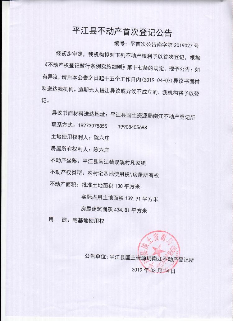 陈六庄平江县不动产首次登记公告南字第2019027号
