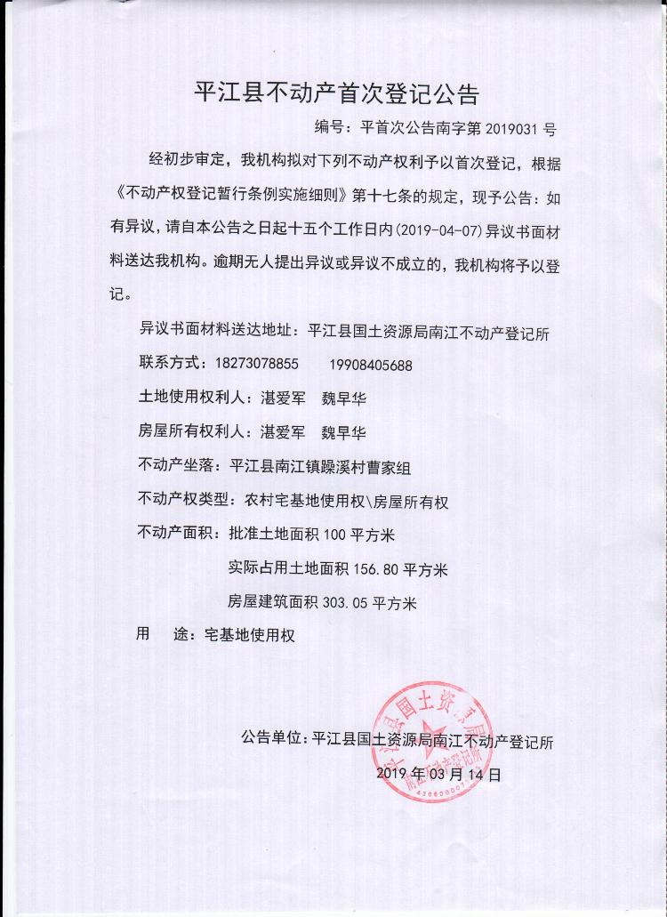 湛爱军 魏早华平江县不动产首次登记公告南字第2019031号
