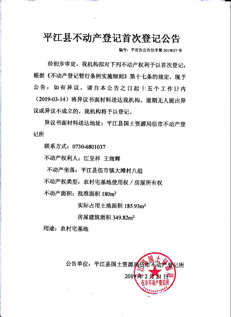江呈祥 王细辉 不动产首次登记公告 伍字第2019057号